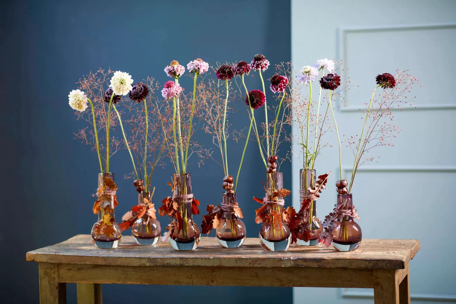 Scheinbar einfach, aber wenn man genau hinschaut, entdeckt man immer mehr Details in diesem Tischstück. Und das Beste daran: Für diese Komposition muss man erst einmal in den Wald gehen, um Herbstfunde zu machen! Die Vasen sind mit Herbstblättern geschmückt und Kastanien sind auf einige Scabiosa-Stängel aufgefädelt. Die Stars sind natürlich die Scabiosas, aber das BLOOM's-Team hat sich auch für Talinum 'Long John' entschieden. Und wir verstehen auch warum. Die Zweige sind voller winziger Samenkapseln in herbstlichen Farbtönen.