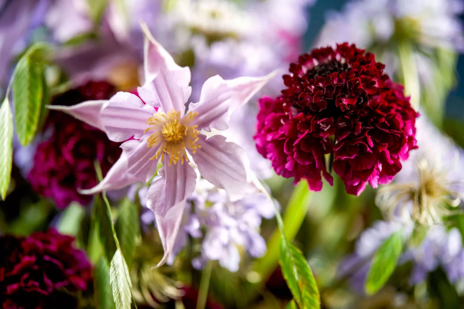 Auf diesem Bild ist deutlich zu sehen, dass die Scabiosa zarte hellviolette Akzente hat. Und diese wiederum passen perfekt zu den hellvioletten Farbtönen der Clematis Amazing® London. Die dritte Blume ist Astrantia Star® of Love und der Strauß wird von einem Kragen aus Panicum 'Northwind' umrahmt.