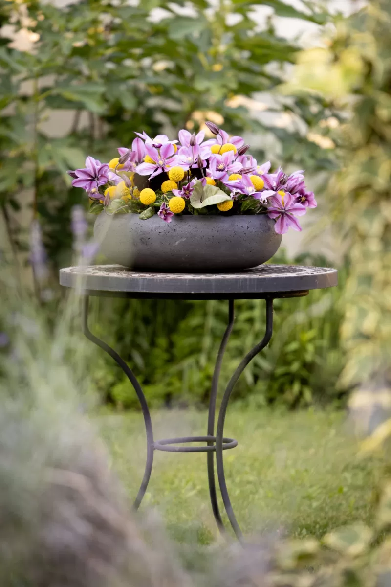 Krisztián Kövér has created a collection of luxurious designs for the interior and garden. The collection begins with two circular artworks featuring soft pink Scabiosa Bon Bon Scoop™ French Vanilla and purple-blue Clematis Amazing® Oslo. This is followed by a decorative screen in soft tones with Scabiosa, Clematis Amazing® Miami, and the feathery blooms of the smokebush. The screen’s transparent effect is achieved by wrapping ribbons around a thin frame.